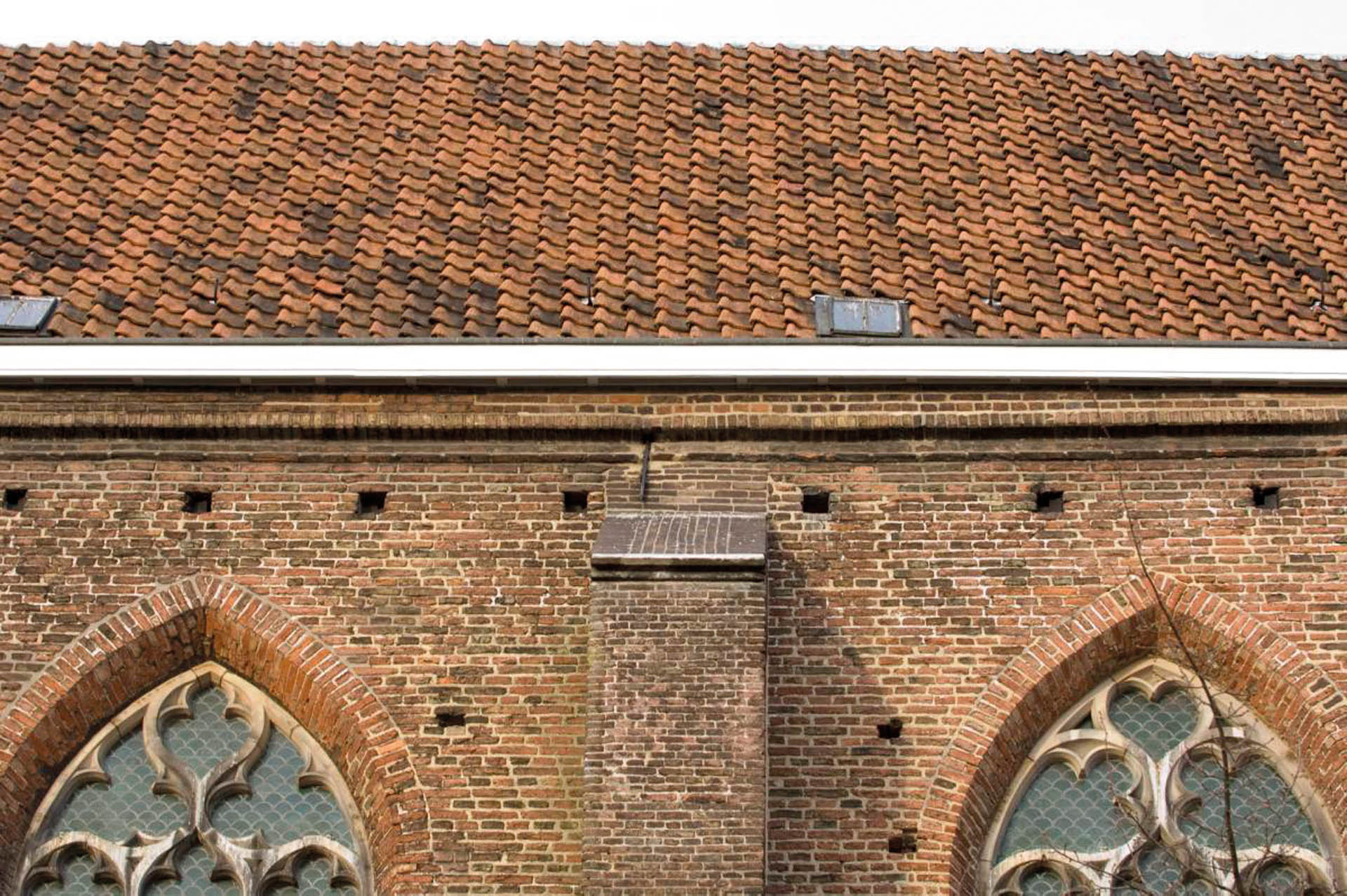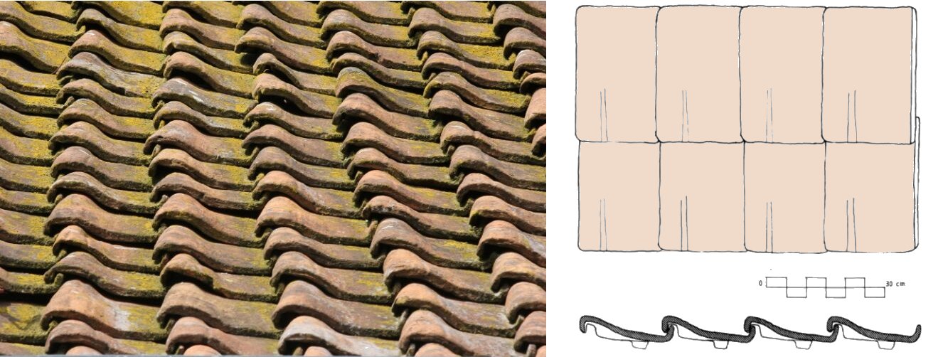 De Hildesheimer dakpan komt origineel vanuit Duitsland; hij zou in 993 uitgevonden zijn door een zekere bisschop Bernward von Hildesheim (uit het gebied dat dezelfde naam draagt). Het is een links enkeldekkende overslagpan (wat minder vaak voorkomt) waarbij de ‘wel’ (ook wel de brede, overlappende rand) dus aande linkerzijde zit. De exemplaren aangetroffen in Nederland worden meestal rond 1500 gedateerd. Aan (o.a.) de oostzijde van ‘ons’ klooster ligt er nog dergelijke dakbedekking (zoals te zien op onderstaande foto). Ook op andere kerkcomplexen in Nederland zijn deze soort nog wel terug te vinden, zoals op de Broerenkerk in Zwolle